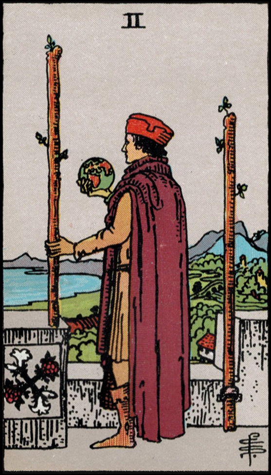 1. Symbolism of the Two Wands: The Two of Wands typically depicts a figure holding a globe in one hand and grasping a wand in the other. This person stands between two wands planted firmly in the ground, symbolizing the potential for growth and expansion.
